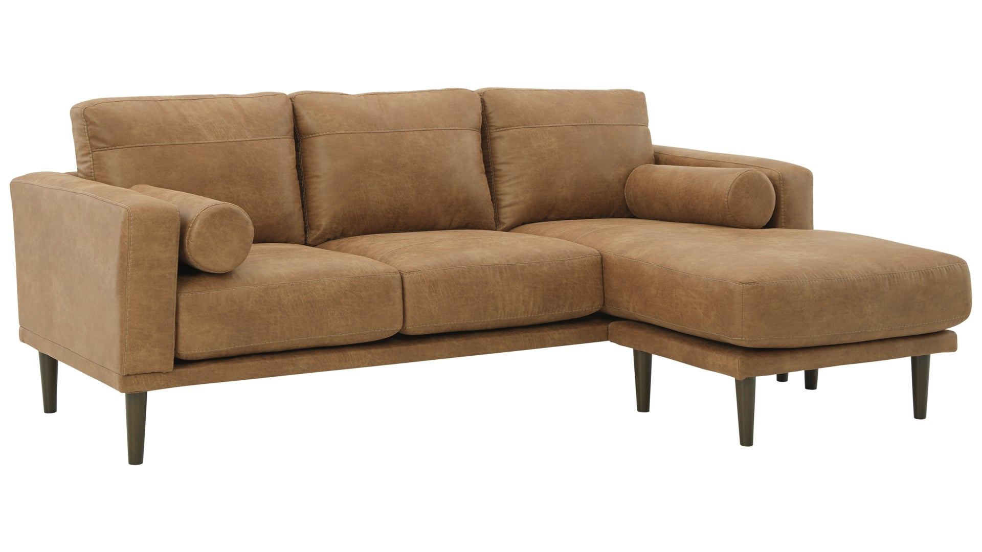 For a fresh spot in your space, turn to this sofa chaise. The invigorating piece breathes warmth into your home with its striking caramel faux leather upholstery, modern bolster pillows and tapered legs. Wind down at the end of a long day and sink into this canyon of comfort.