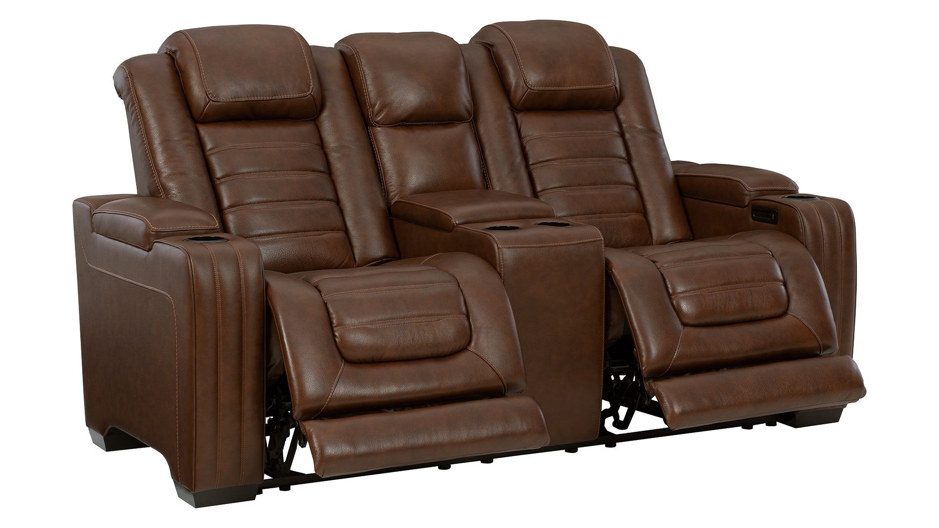 With its fashion-forward sense of style, this power reclining loveseat has you covered with high-tech advancements and down-home comfort. For starters, the seating area and armrests are upholstered in real leather for true indulgence where it matters most. Love being pampered? With the touch of a button, experience the pure bliss of an air massage system (with three settings), or chill out with the heated seat element. Distinctive elements of this power recliner include contemporary waterfall tufting that beautifully goes with the flow and a zero-gravity mechanism further raising the ottoman for better blood flow.Dual-sided reclinerOne-touch power control with adjustable positions, Easy View™ adjustable headrest and zero-draw USB plug-inZero-draw technology only consumes power when the USB receptacle is in useAir massage system includes 3 settings: steady, pulse and wave (with automatic 20-minute shutoff feature)Heat in the seat element (with automatic 30-minute shutoff feature)Corner-blocked frame with metal reinforced seatAttached back and seat cushionsHigh-resiliency foam cushions wrapped in thick poly fiberZero-gravity mechanism (raises the ottoman to 23" off the floor for improved blood flow)Extended ottoman for enhanced comfortLeather interior seating; vinyl/polyester exterior upholsteryConsole with storage and 2 cup holdersPower cord included; UL Listed