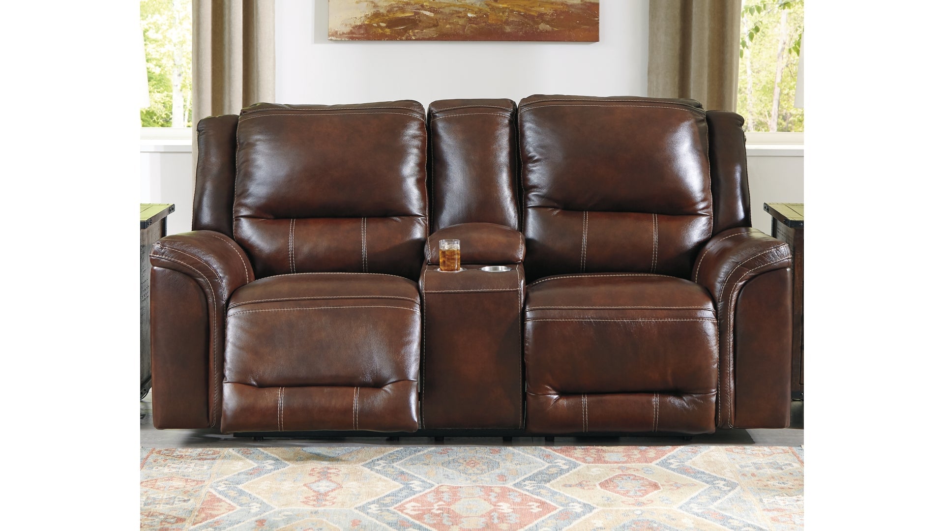 Let the luxury of this power reclining loveseat with console carry you away. Decidedly modern, with clean-lined divided back styling, this reclining loveseat entices with genuine leather covering the seating area and armrests for a supple feel. Even when you’re kicking back you’ll still be perfectly positioned to read or watch TV thanks to the Easy View™ power adjustable headrest. And how’s this for a bonus: a convenient USB charging port located in the power control, so you can recharge while you chill.Dual-sided reclinerOne-touch power control recliners with adjustable positionsIncludes USB charging port in each power controlLift-top storage console with slow close hinges and 2 stainless steel cup holdersCorner-blocked frames with metal reinforced seatsAttached backs and seat cushionsHigh-resiliency foam cushions wrapped in thick poly fiberEasy View™ power adjustable headrestsExtended ottomans for enhanced comfort100% genuine top-grain leather throughout the seating areas and armrestsHigh quality leather substitute covers remaining areasPower cord included; UL Listed