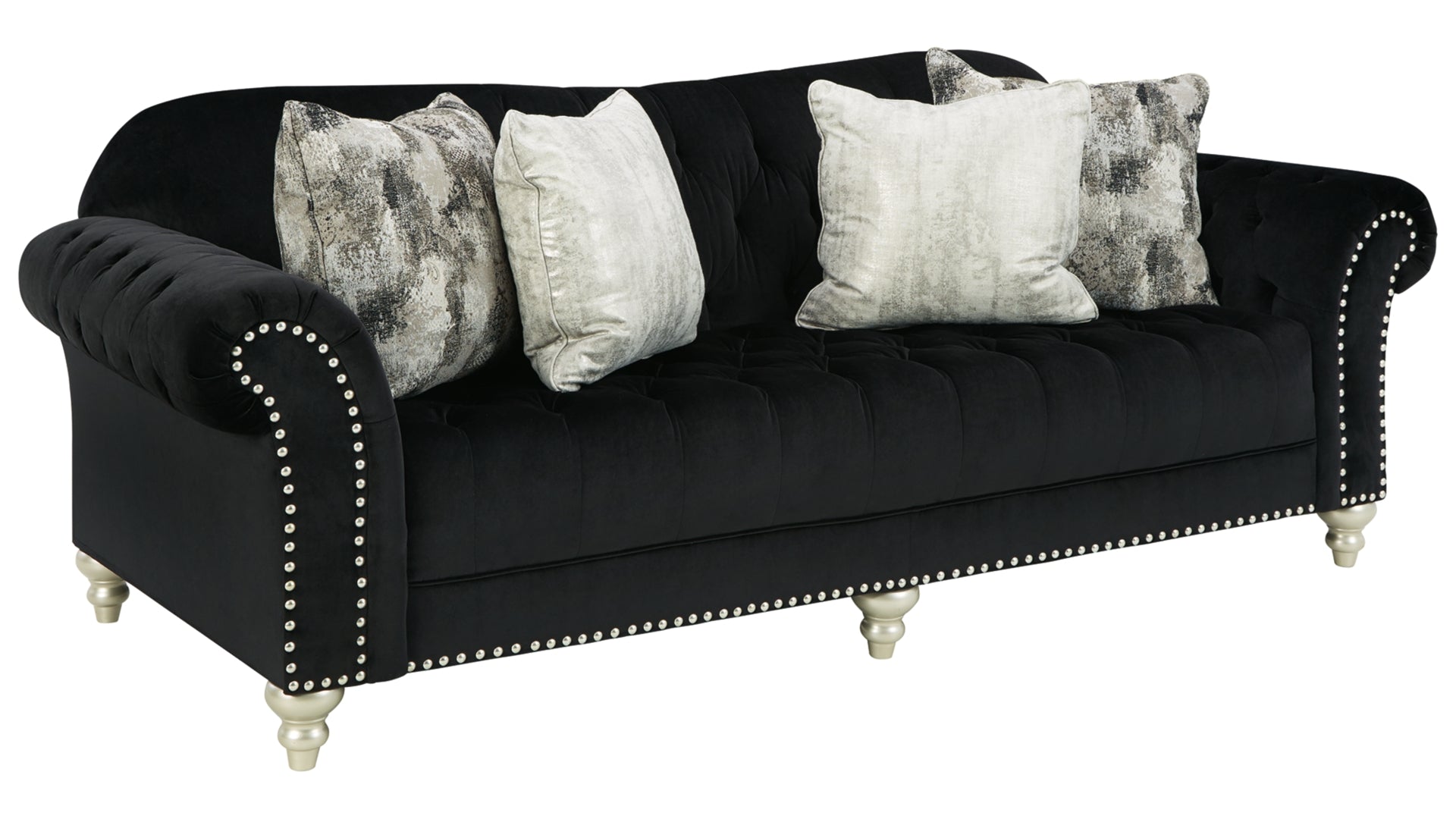 Talk about Academy Award winning style. Inspired by Hollywood Regency design, this stunning black upholstered sofa brings glamour and indulgence into the here and now. Its button-tufted details, reverse camelback profile and nailhead trim are so rich and classic. Elegant turned feet in a dazzling silvertone finish perform beautifully, too. Bravo.
