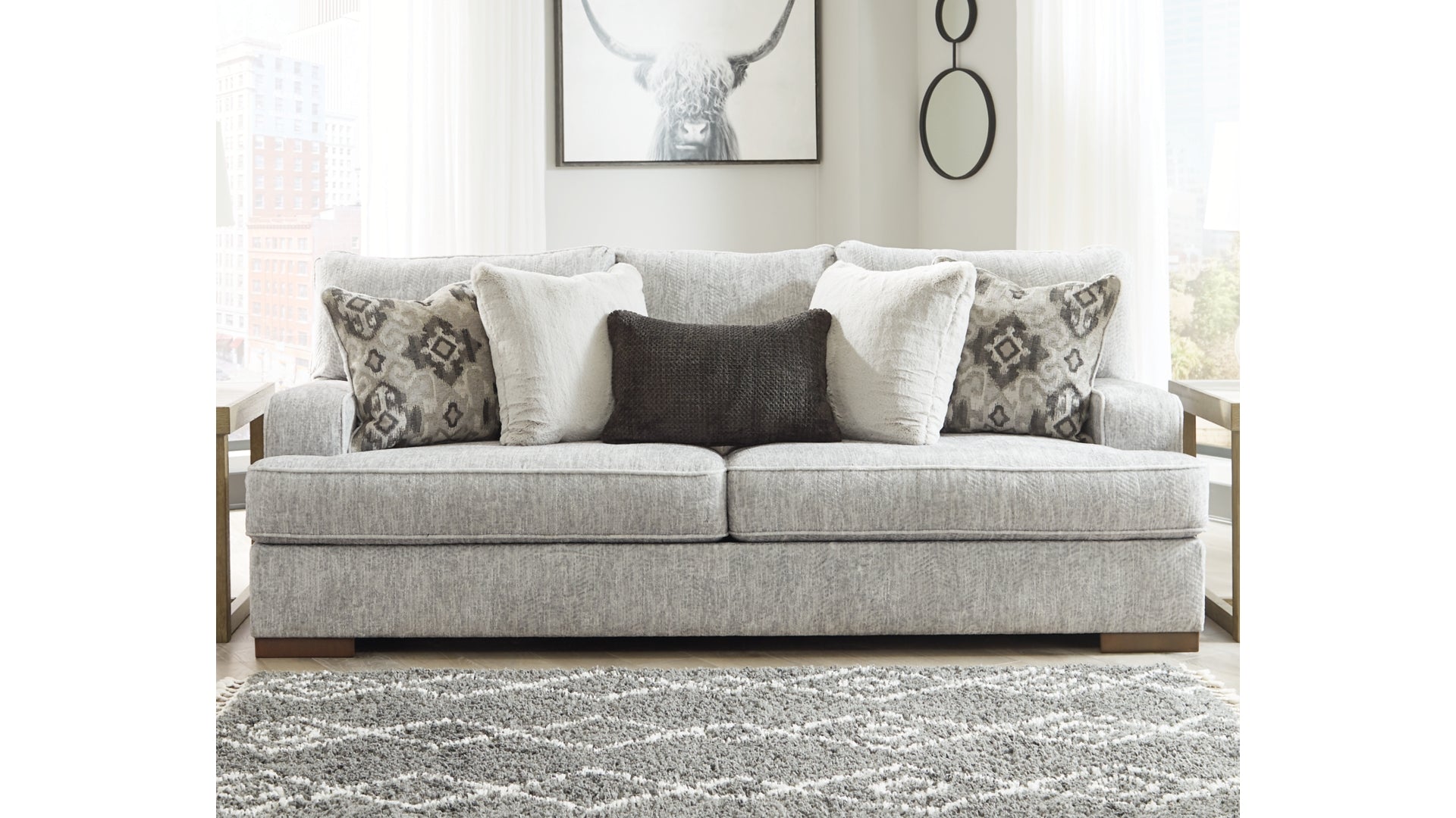 An indulgent choice with deep seats crafted for cloud-like softness, this designer sofa is the ideal merger of modern flair and classic staying power. If you love a touch of texture, you’re sure to appreciate this sofa’s gorgeous gray upholstery with subtle chevron effect. Posh toss pillows layered over the loose back cushions perfect the richly relaxed aesthetic.