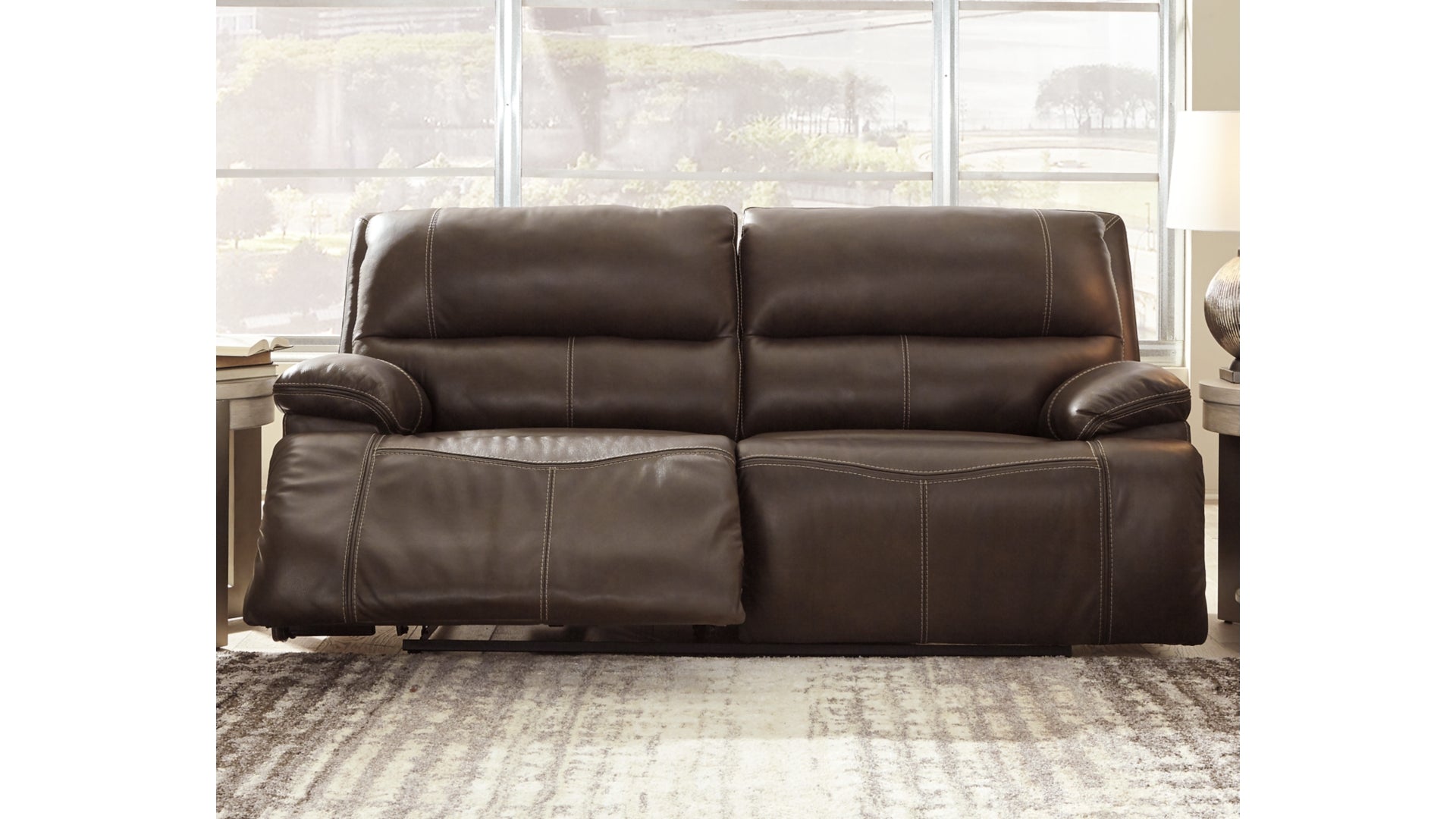 Life is so much better when you can enjoy the pleasure of real leather—at a price to put you at ease. That’s exactly what you get with this power reclining sofa. Thanks to real leather throughout the seating area, you've got a reclining sofa that feels like a million bucks but won’t break the bank. Tailored to those with an eye for contemporary design, this power reclining sofa is dressed to impress with an upscale matte finish, clean-lined divided back tufting, distinctive jumbo stitching and chic pillow top armrests. Perhaps best of all: Easy View™ power adjustable headrests let you recline back and still have a primo view of the TV.